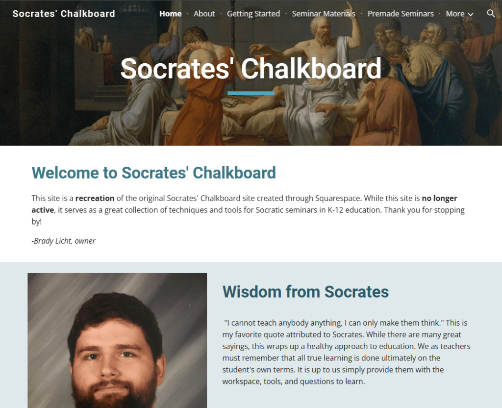 The experience of implementing these seminars led to the creation of Socrates’ Chalkboard, a website designed to share these resources and insights with other educators. Though the website would only operate for a year due to the competing demands of my master’s program and other professional projects, it served as an important platform for documenting and sharing these teaching practices.