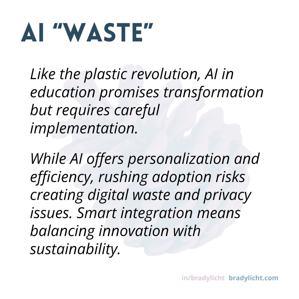 This enthusiasm for AI in education reminds me of another transformative technology that rapidly changed our world: plastics.