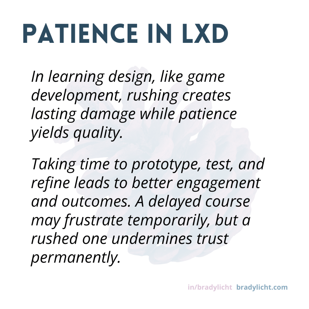 Remember, in learning experience design, as in game development, patience truly does pay off. A delayed learning experience may cause temporary frustration, but a rushed one can damage learner trust and organizational effectiveness for years to come. Let’s take the time to get it right – our learners deserve nothing less.