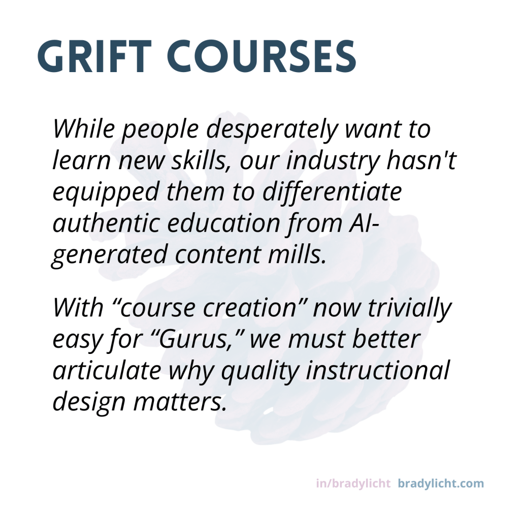 What frustrates me most is how this trend devalues the actual craft of online learning design. As someone who’s spent years studying and practicing instructional design, it’s disheartening to see complex pedagogical principles reduced to “just record some videos and upload them.”