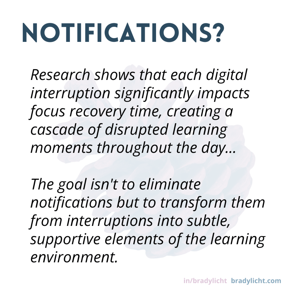 The goal isn’t to eliminate notifications but to transform them from interruptions into subtle, supportive elements of the learning environment.