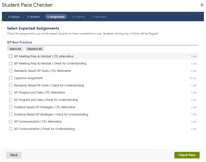 Assignments: This is the key step. Check every assignment you would expect a student to have completed by this point in the course. The tool doesn’t know your pacing schedule, so you’re telling it what “on pace” means right now. Students missing any of these checked assignments will be flagged.