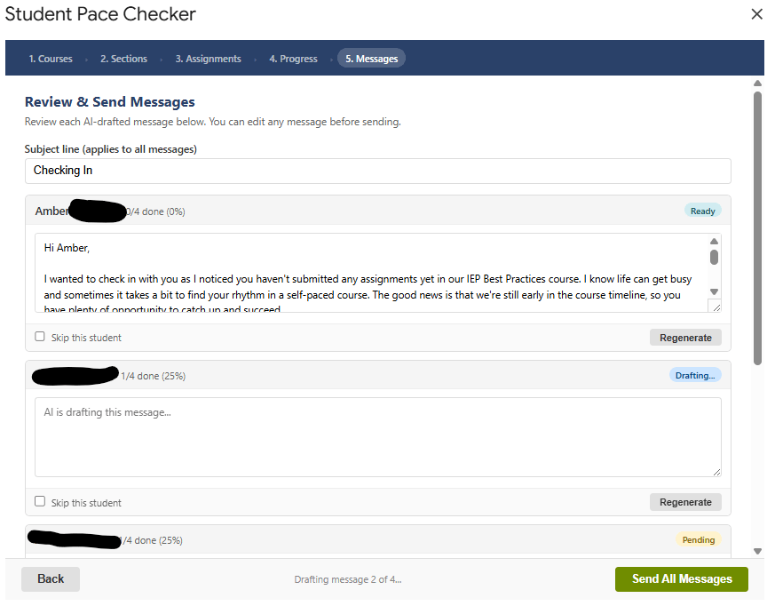 Messages: If students are behind, you move to the drafting step. The tool sends each student’s progress data to Claude one at a time, and you’ll see the messages appear as they’re drafted. Each message shows up in an editable text area, so you can rewrite any of them before sending. You can also skip individual students, regenerate a draft you don’t like, or change the subject line.