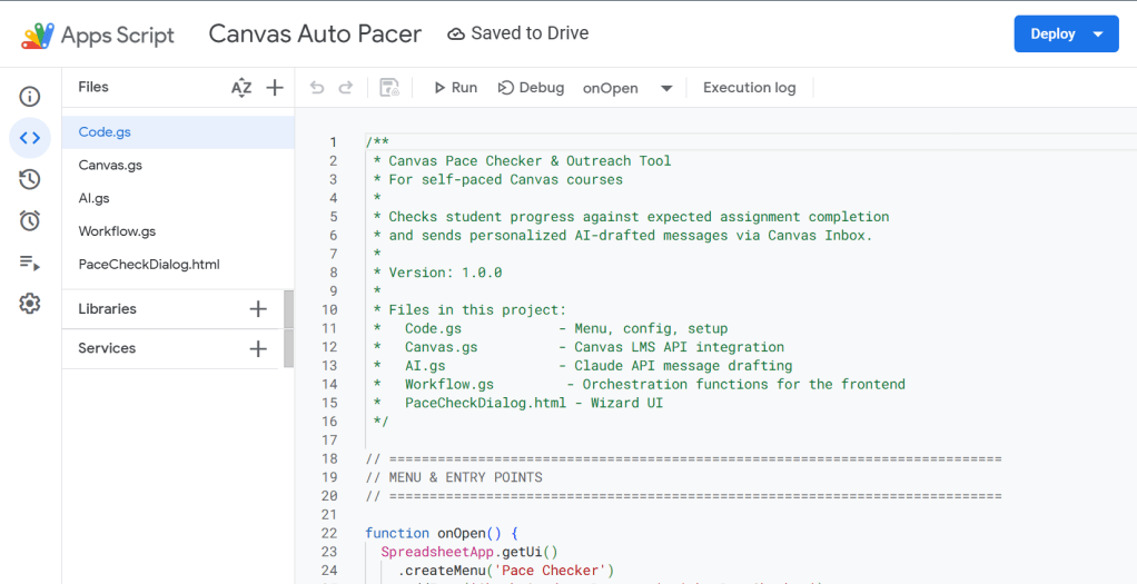 The code is organized into separate files by function: Canvas API calls, AI drafting, workflow logic, and the dialog interface. If you’re comfortable with Apps Script and want to modify behavior, each file has comments explaining what it does and why. A few ideas people have asked about: