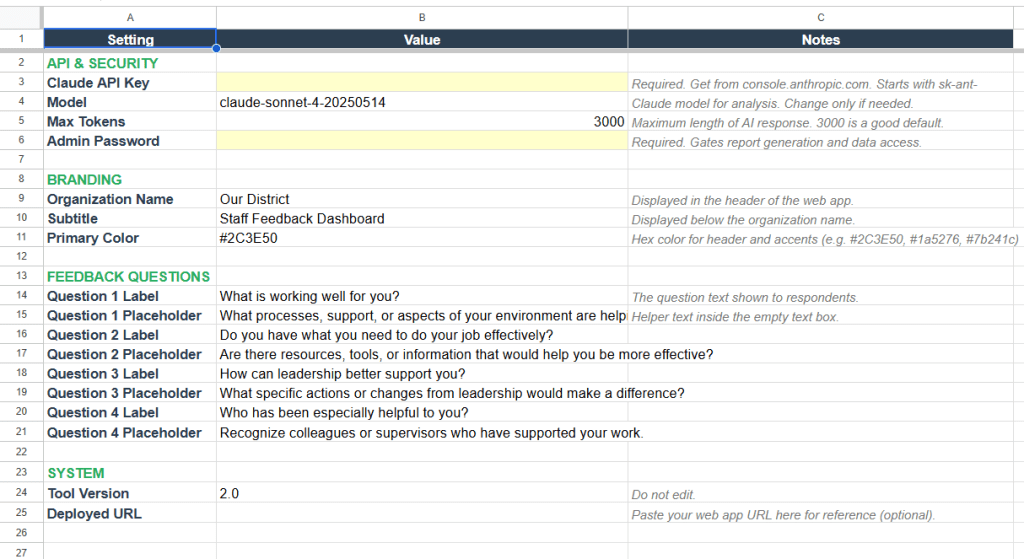 Step 2: Add your Claude API Key. This is the one required step that involves an external service. You will need an Anthropic account and an API key, which you can get at console.anthropic.com. Paste the key into the Value column next to “Claude API Key.” The key starts with sk-ant- and is what allows the tool to generate AI analysis reports. Each report costs a small amount (typically a few cents, depending on the number of responses being analyzed). You can leave the Model and Max Tokens settings at their defaults.