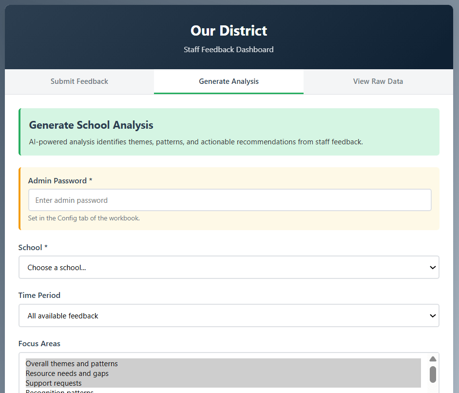 The Staff Rounding Dashboard is a free, open-source Google Apps Script tool that handles the full rounding workflow. Staff submit anonymous feedback through a clean web interface. Administrators can view raw response data, filter by school and time period, and generate AI-powered analysis reports that identify themes, surface resource needs, and suggest specific actions. Everything runs inside a Google Sheet that your district controls.