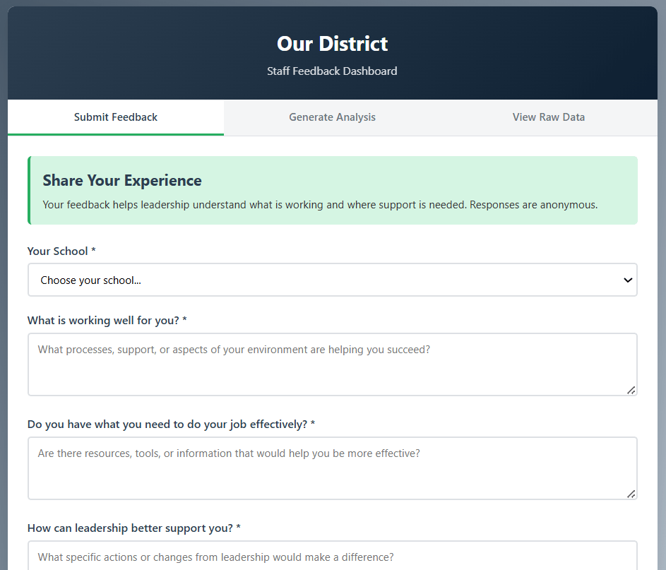 This tool is designed for building principals, district administrators, and anyone in a leadership role who wants a structured way to collect and act on staff feedback. It works well for individual schools and for districts managing multiple buildings. It is not a replacement for deep conversations, walk-throughs, or the relationship-building that effective leadership requires. It is a starting point, a way to make the asking and listening part more consistent and the pattern-finding part less manual.